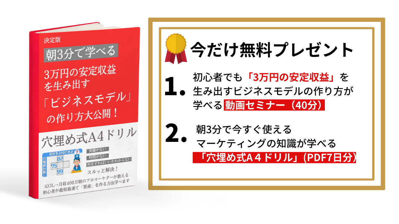 最短最速でオンライン上にあなたの「資産」を作る方法が学べます。無料メルマガ登録で、今だけ豪華2大特典プレゼント中↓